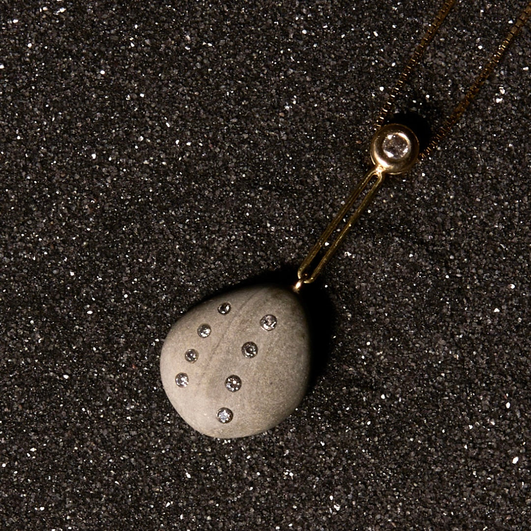 Each Lake Tahoe pendant is one of a kind, featuring diamond and gem-studded stones collected from the west shore beach where I spent summers growing up, in front of the house where I got married.