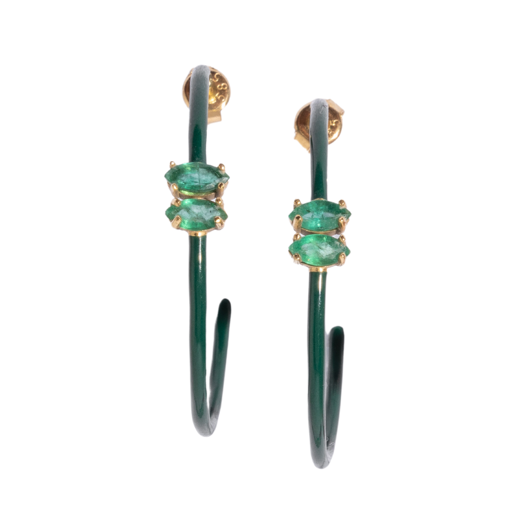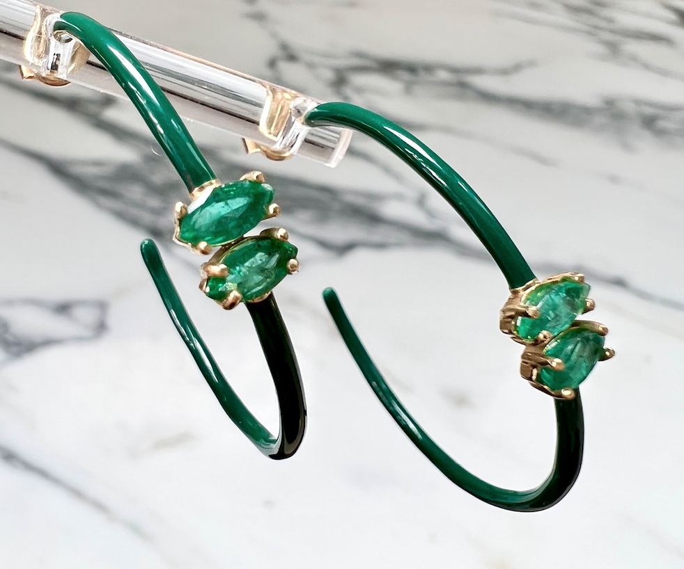 14K Gold Marquise Cut Emerald + Green Enamel Valley Girl Hoop Earrings