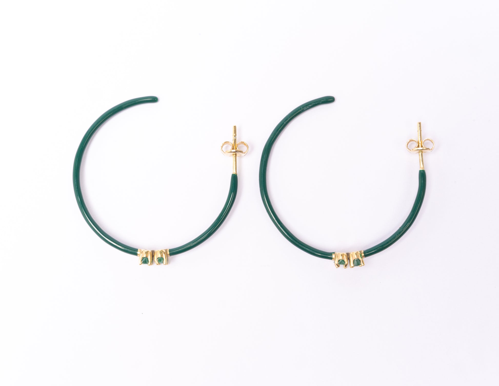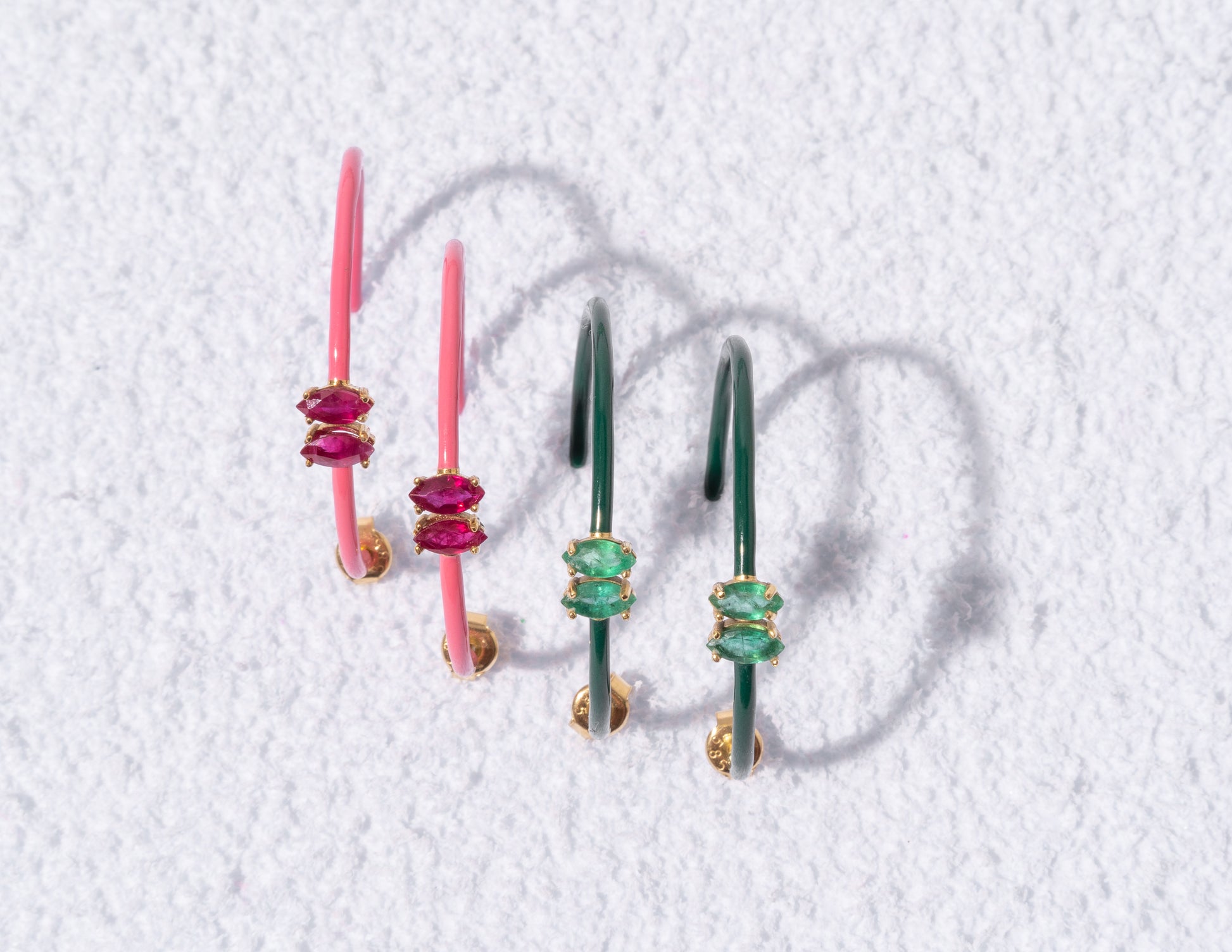 Our retro-inspired 14K Gold + Emerald + Green Enamel Valley Girl Hoop Earrings serve up the vintage vibes of costume jewelry straight out of an 80's cocktail party off Ventura + Laurel Canyon... only this custom set of statement fine jewelry is crafted from 14-karat solid yellow gold and ethically sourced, brilliant precious gemstones with enamel detailing.