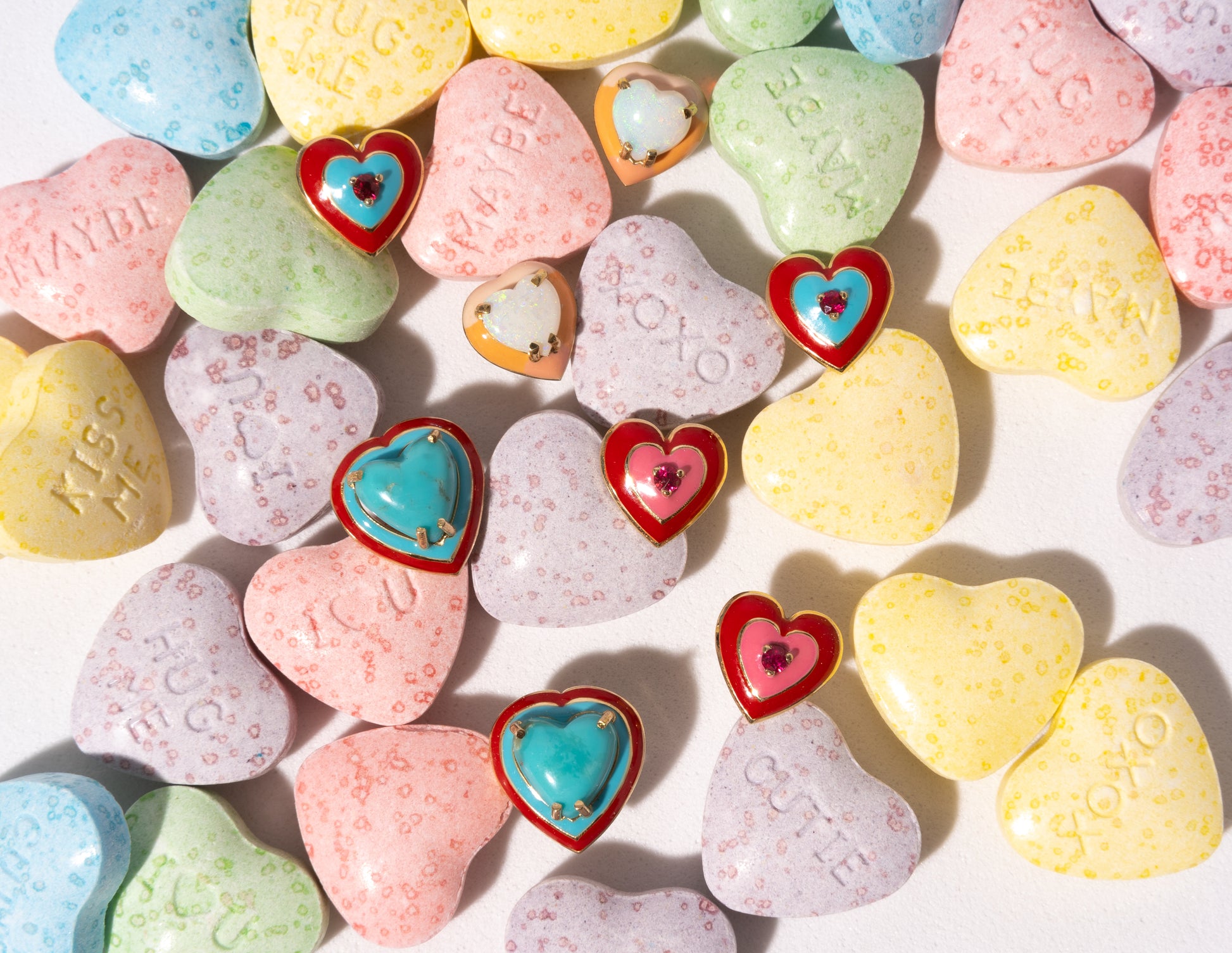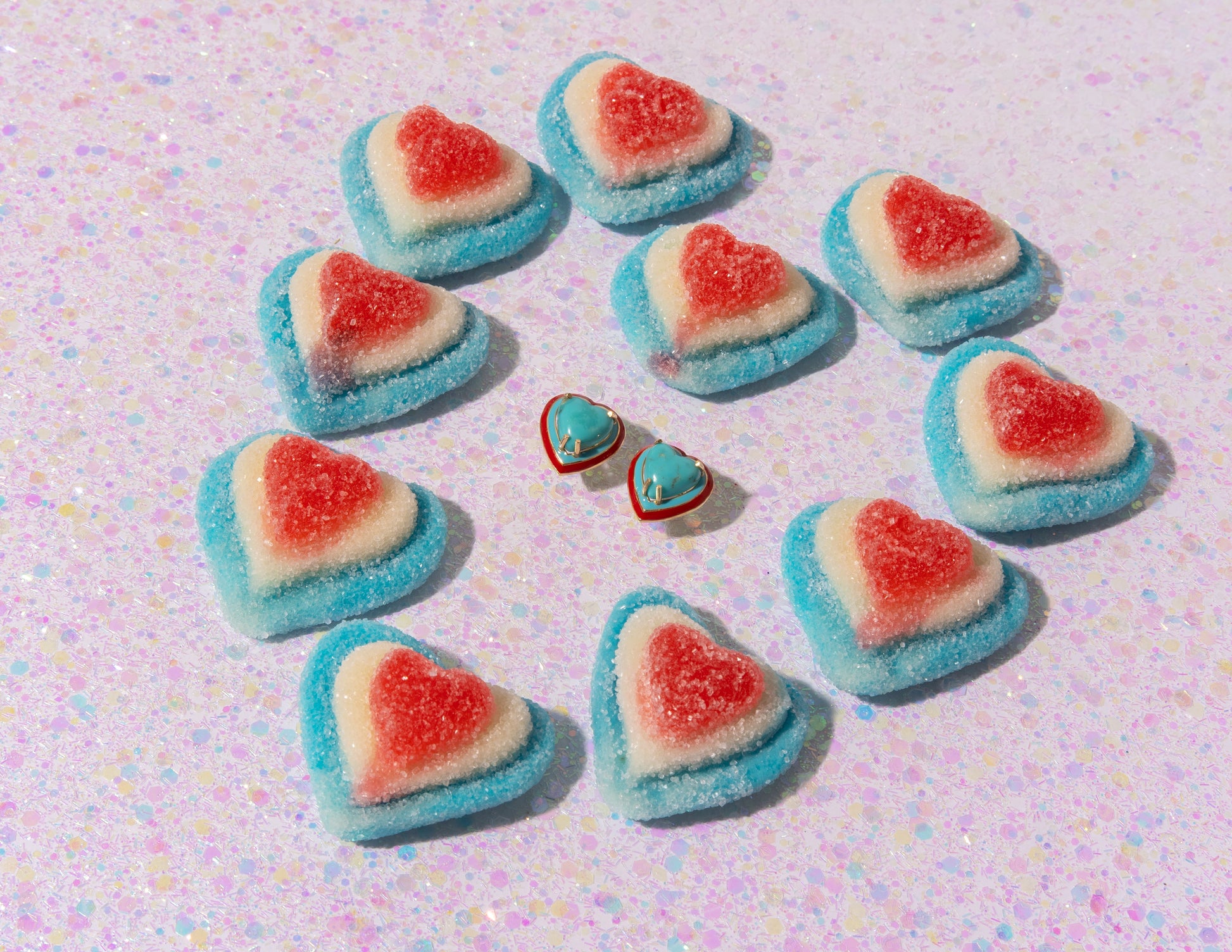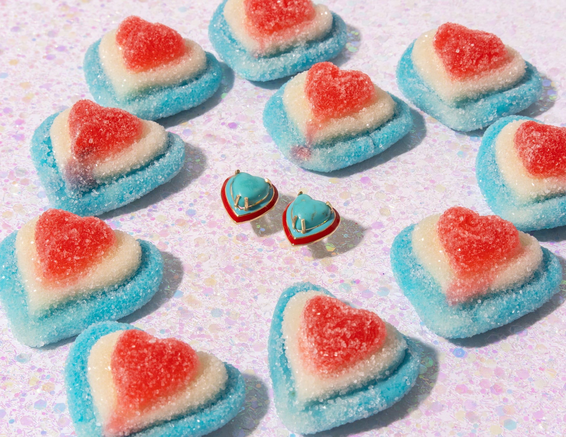 14K Gold Turquoise Heart Cabochon + Red // Turquoise Enamel Sweetheart Stud Earrings